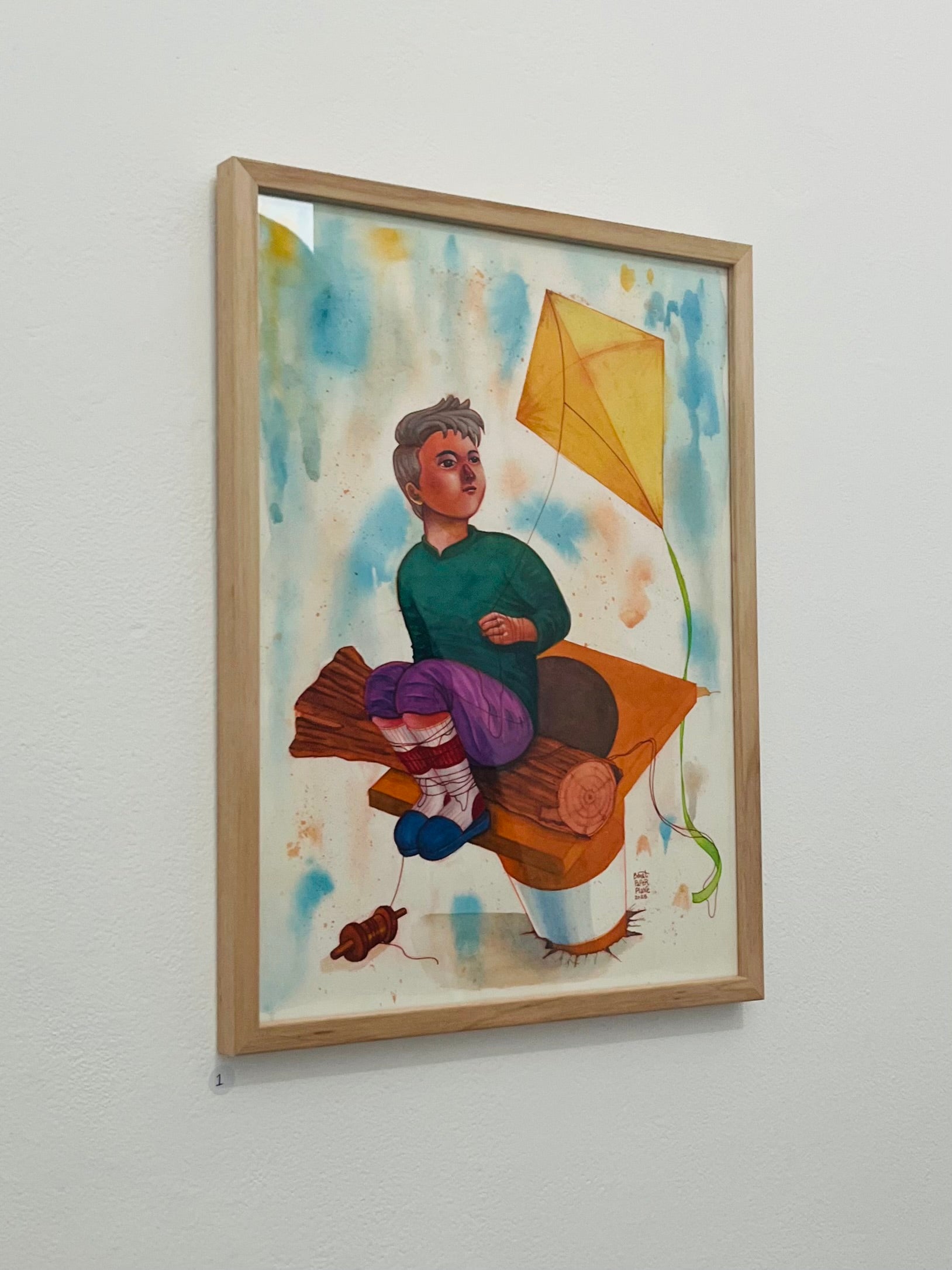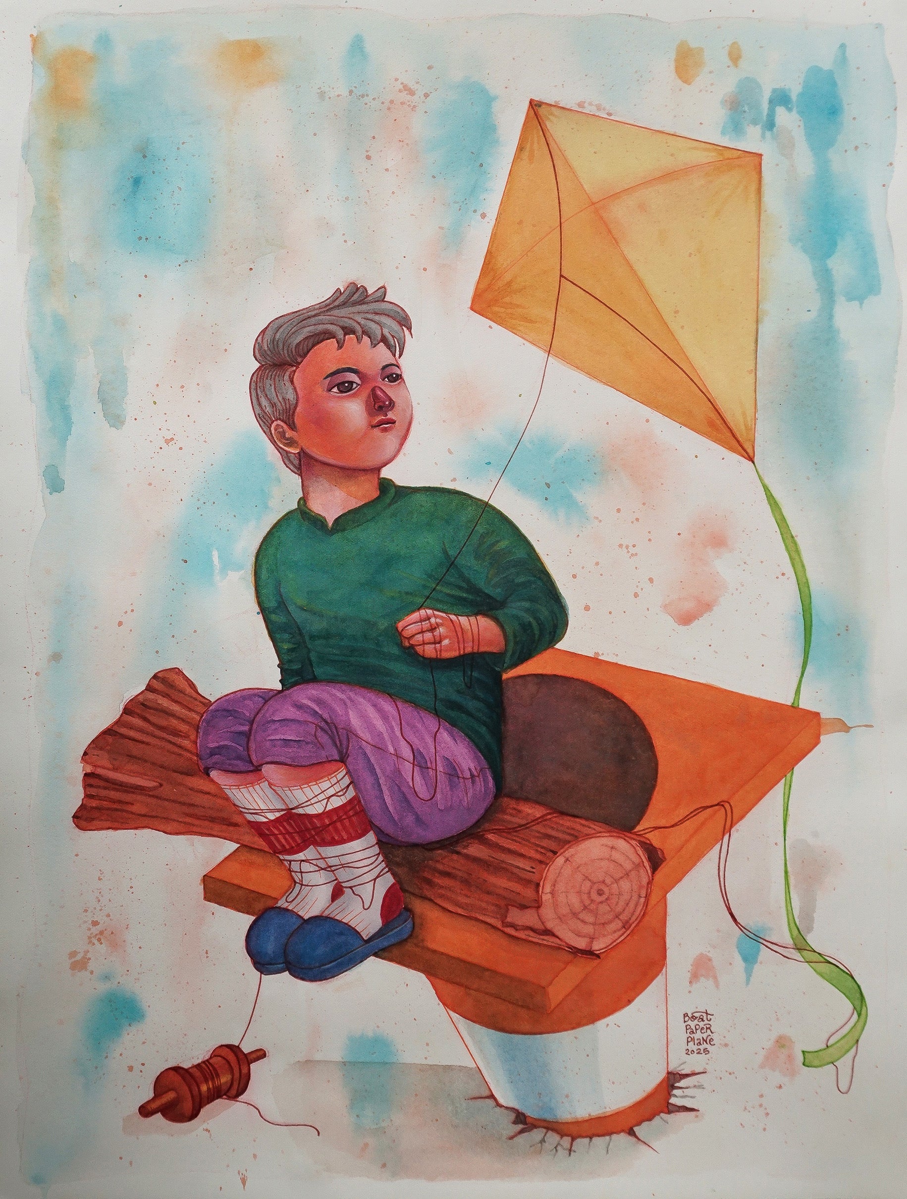 A boy sits still as a kite tugs gently from above, its string wrapped around him. This piece reflects the quiet tension between longing for freedom and feeling held back.