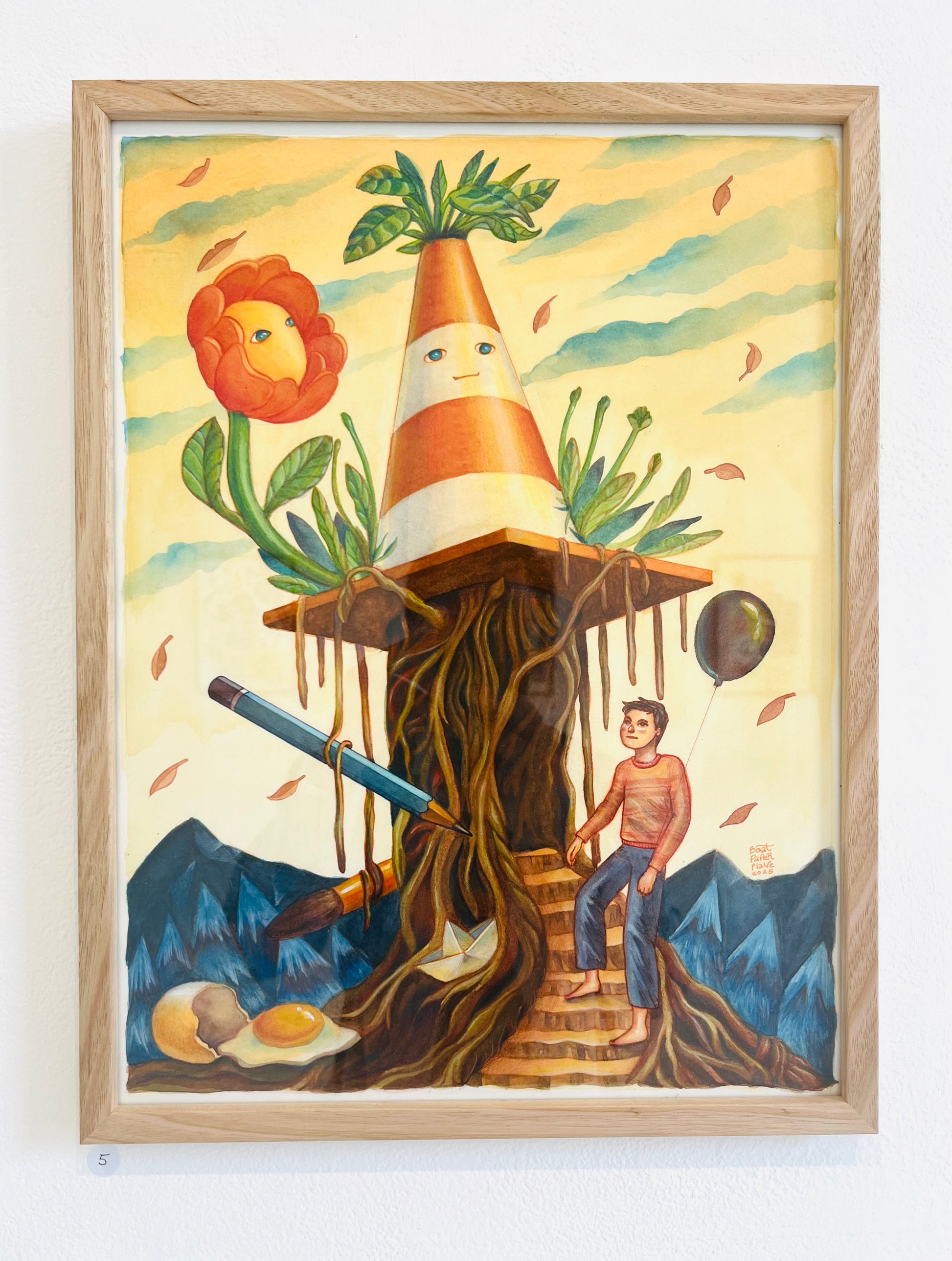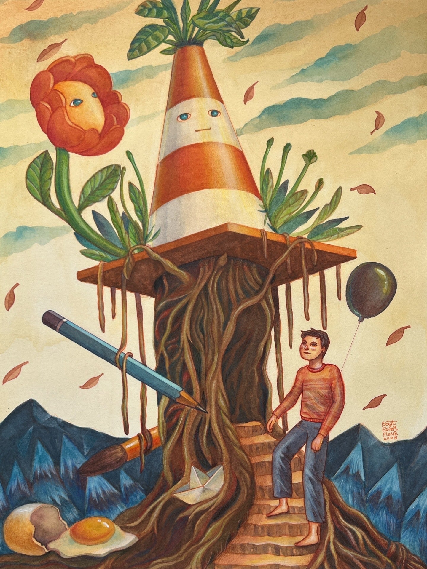 This piece reflects a time in my life when I had to leave art school because of money. At that moment I felt that art was no longer an option for me, which is why the art materials appear tied and hanging on the dead vines of the large tree. Even with that setback, I kept making art because it was something I truly loved. The egg on the ground is a symbol of beginnings and the way each challenge can offer a new start. The sky feels unfamiliar because during that period I did not know what direction my life would take. In the end, that detour became something meaningful. I made new friends, found a job that helped me return to school, and learned lessons that shaped the artist and person I am now. The artwork is about moving through uncertainty and finding beauty in paths that are not straightforward.